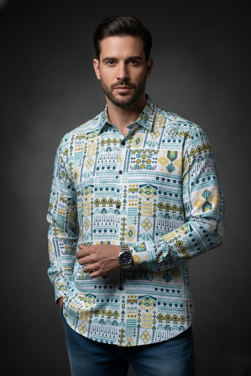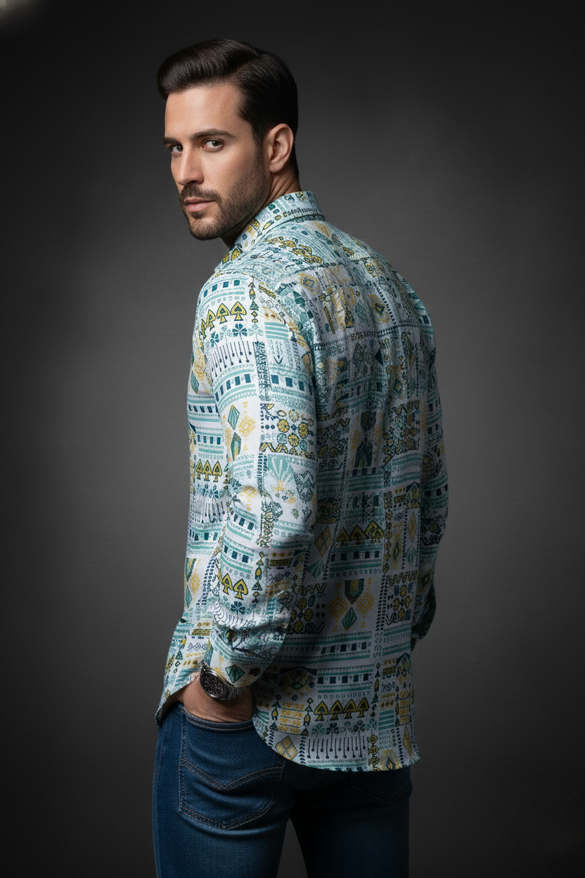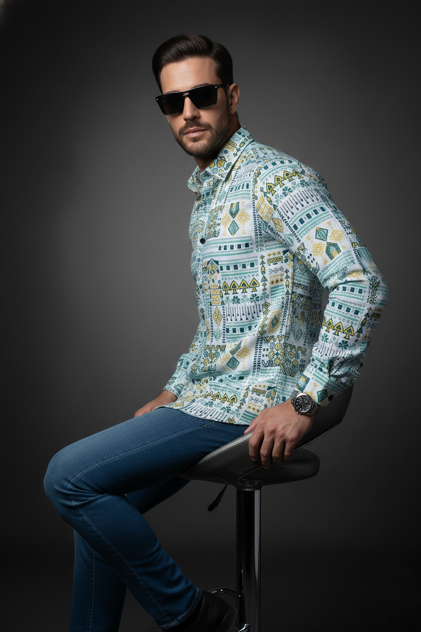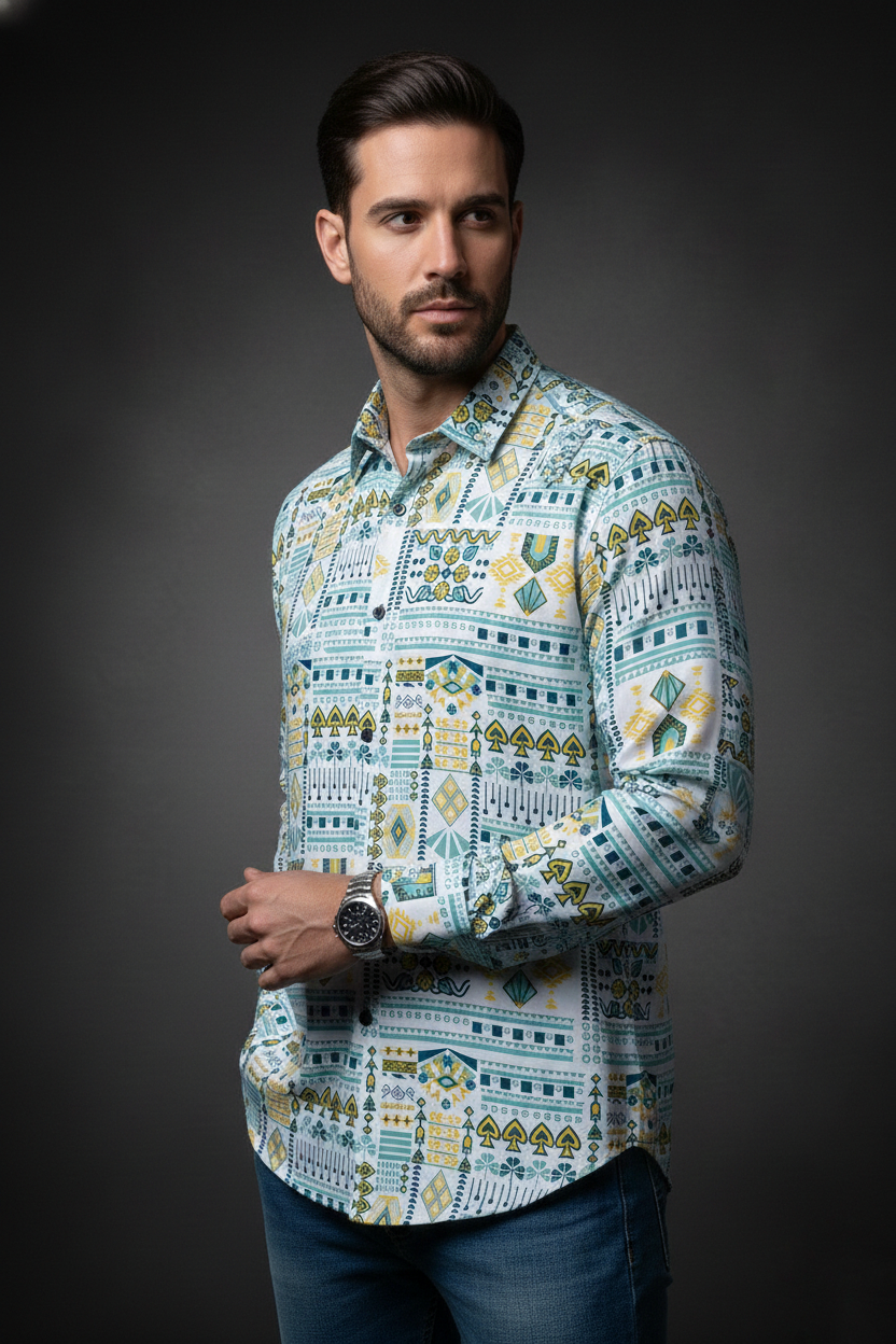 This luxury men’s shirt is crafted for those who appreciate statement style with understated elegance. Designed in a regular collar silhouette with full sleeves, it balances classic tailoring with contemporary attitude.