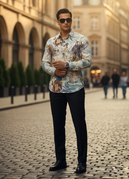 This luxury men’s shirt is crafted for those who appreciate statement style with understated elegance. Designed in a regular collar silhouette with full sleeves, it balances classic tailoring with contemporary attitude.