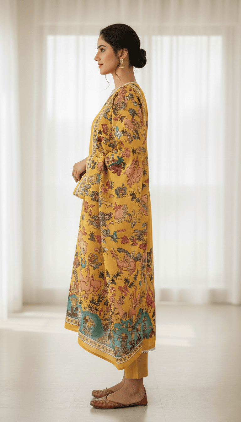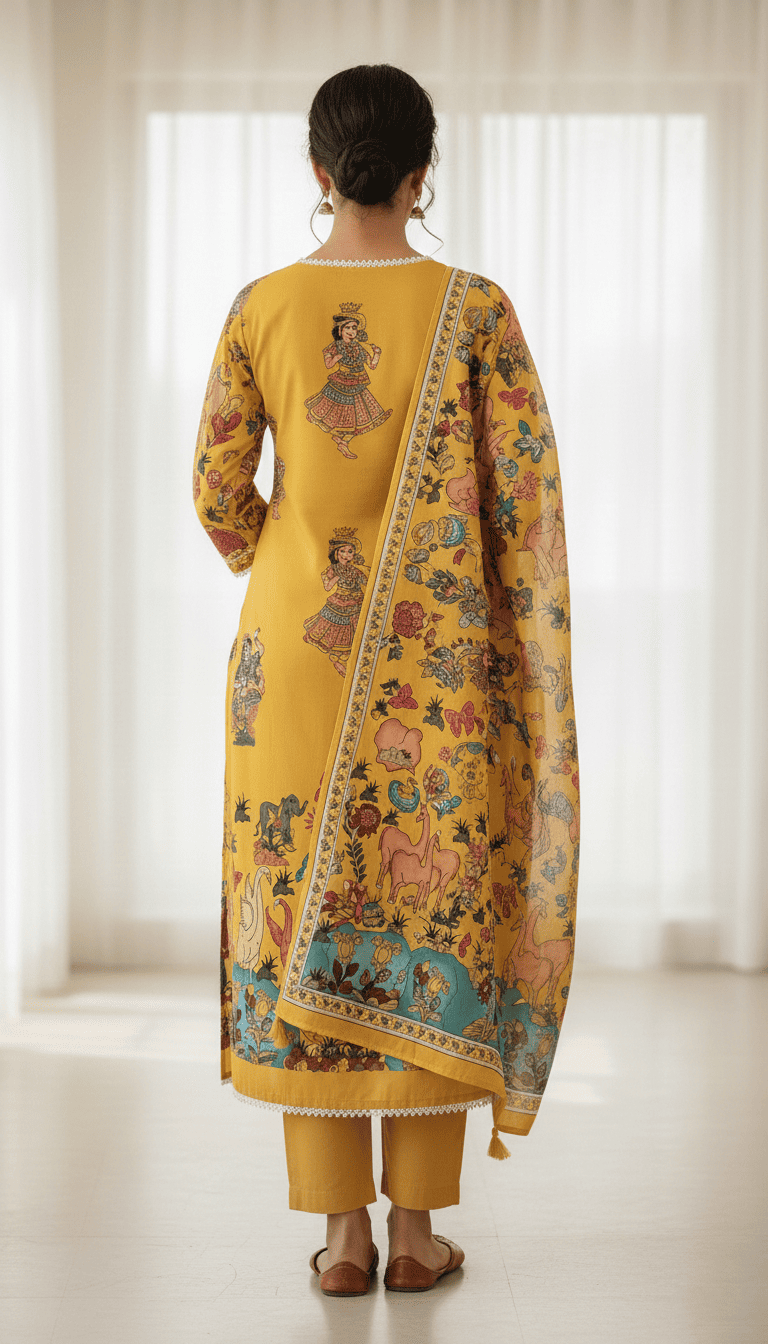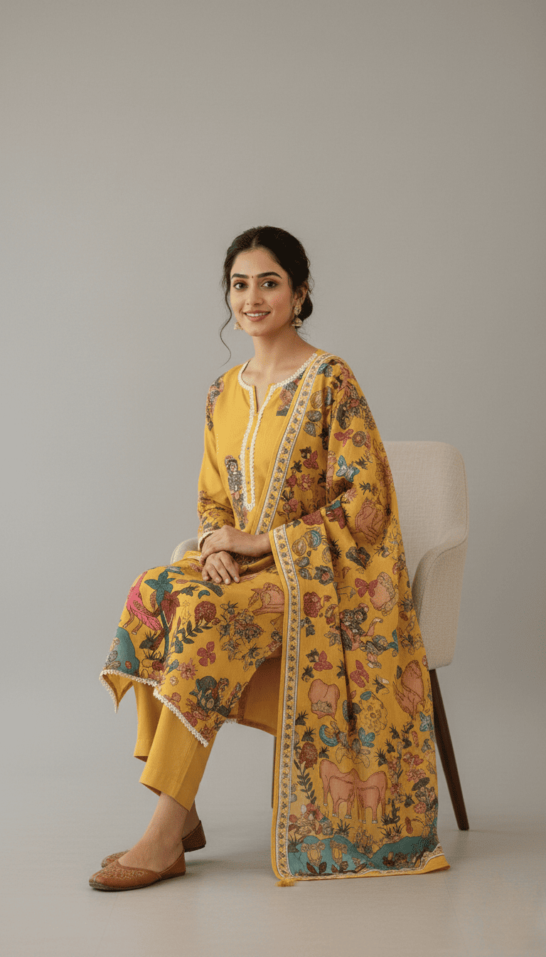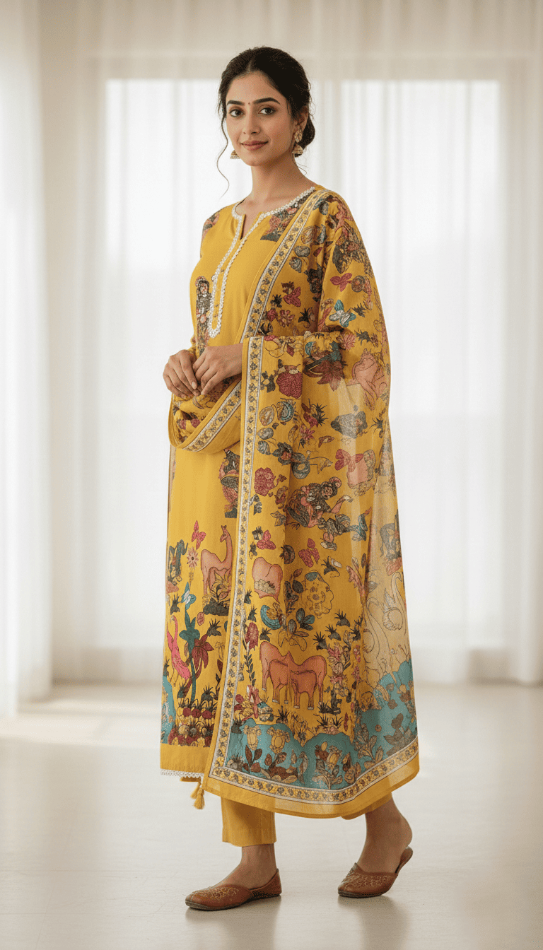 Step into timeless elegance with this royal mustard printed kurta set with dupatta for women. Designed with beautiful heritage-inspired artwork, this outfit blends traditional craftsmanship with modern sophistication. The kurta features a straight-fit silhouette with a classic round neckline and delicate detailing, creating a refined and elegant appearance. The rich mustard yellow base is adorned with intricate artistic motifs and cultural prints, giving the outfit a vibrant and luxurious feel.