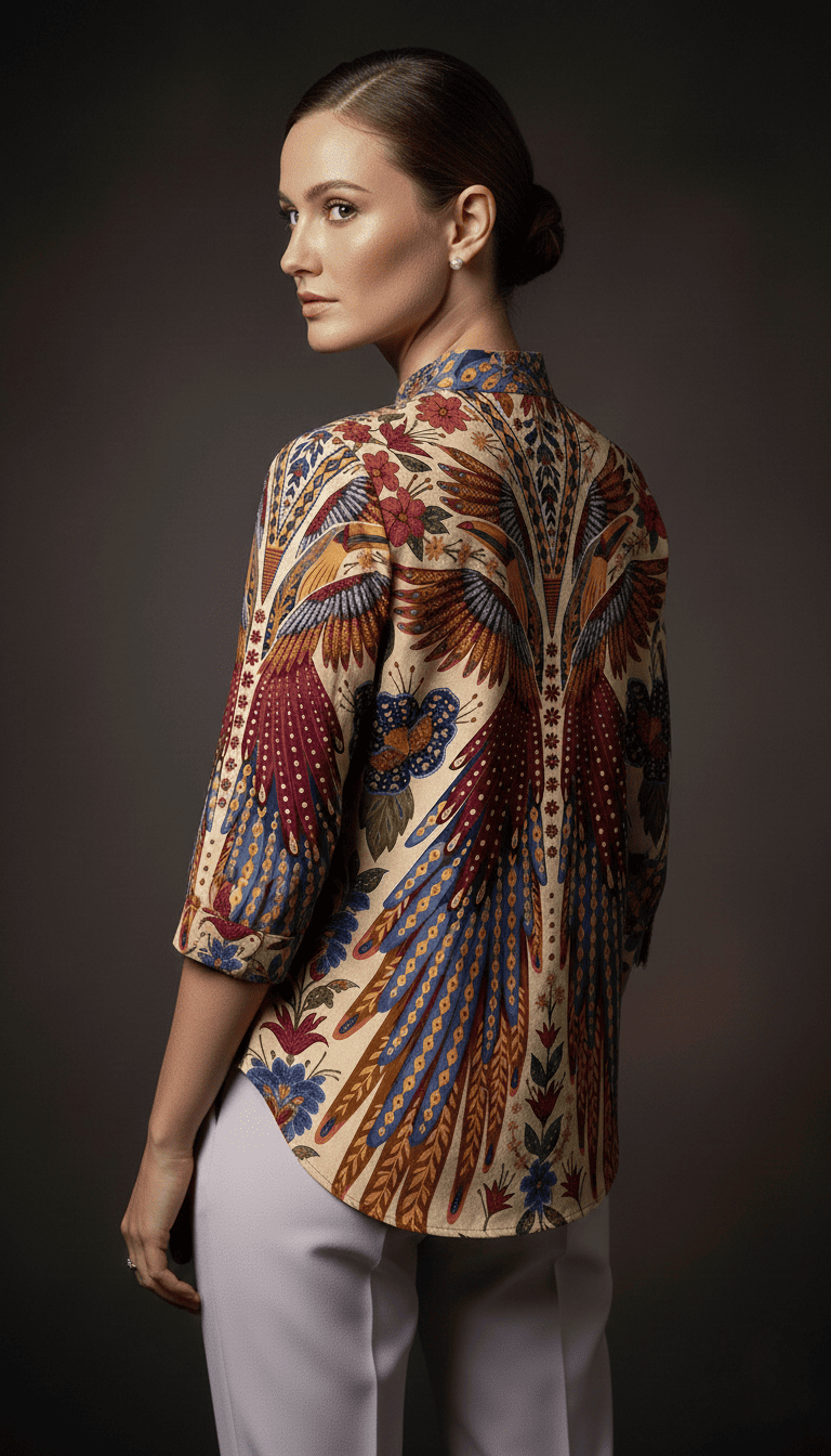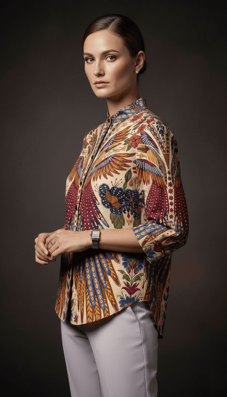 Make a bold style statement with this beautifully designed women’s artistic print top. Featuring a unique bird-inspired pattern combined with elegant floral elements, this top blends modern fashion with artistic detailing. The mandarin collar and button-front design add a refined touch, while the vibrant colors and intricate patterns create a standout look. Crafted from soft and breathable fabric, this top ensures comfort throughout the day.
