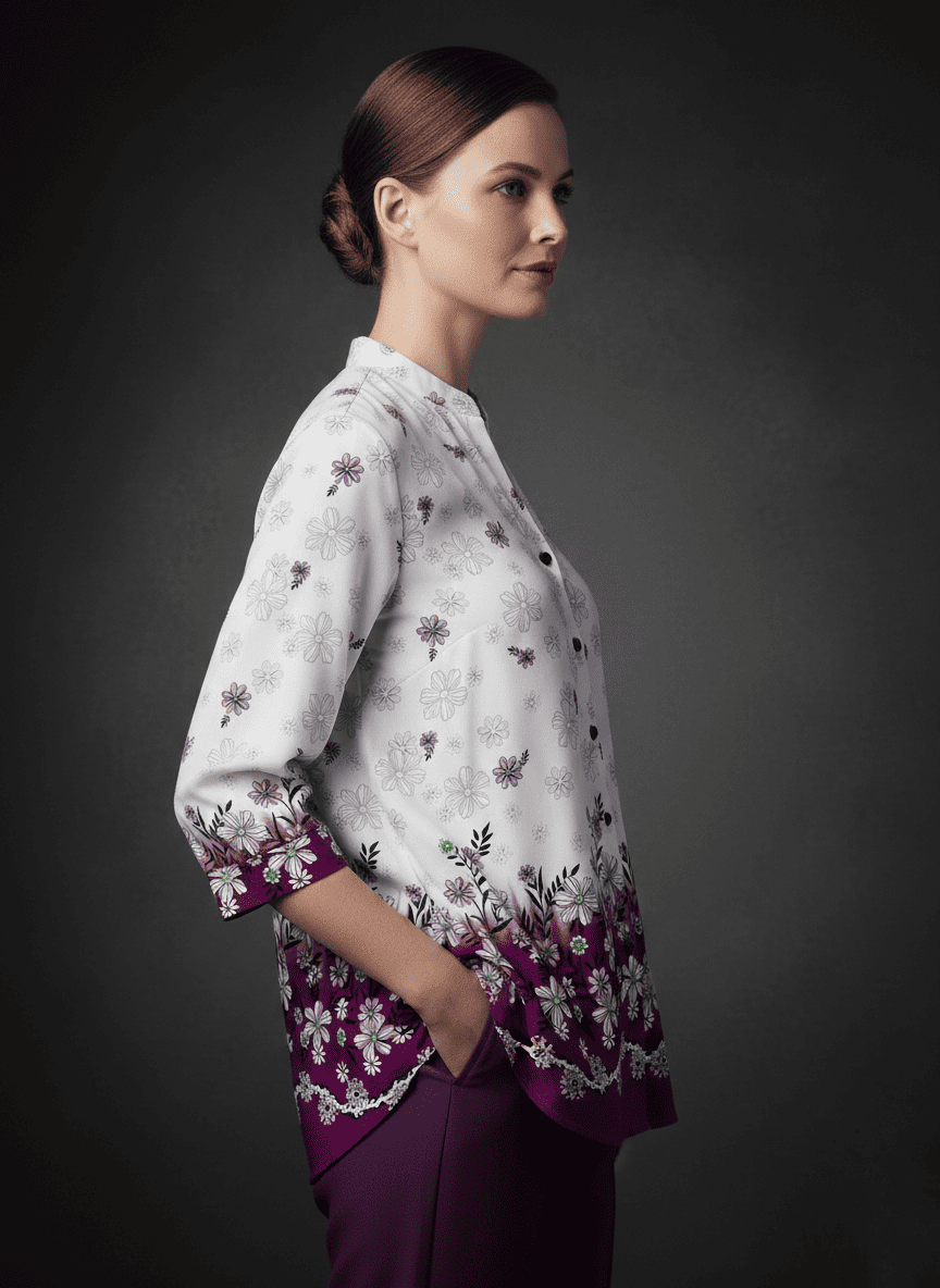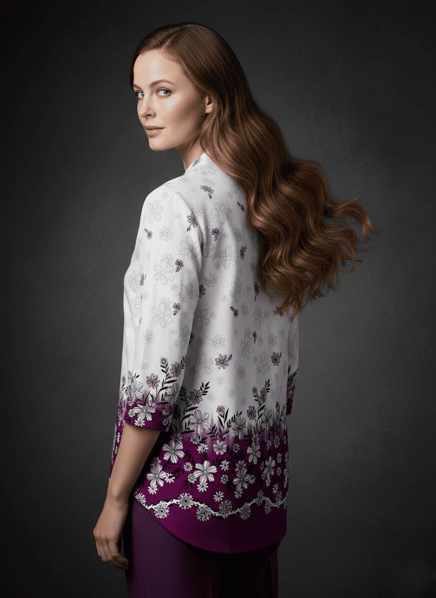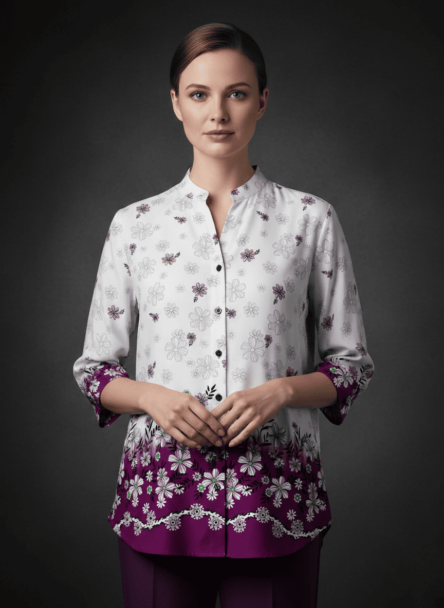 Bring effortless elegance to your wardrobe with this beautifully designed women’s floral border print top. Featuring a modern mandarin collar and delicate floral patterns, this top combines minimal style with graceful detailing. The contrasting floral border at the hem and sleeve cuffs adds a unique touch, making the top stand out while keeping the overall look refined and classy. Crafted from soft and breathable fabric, it ensures all-day comfort whether you’re at work, a casual outing, or a social gathering.